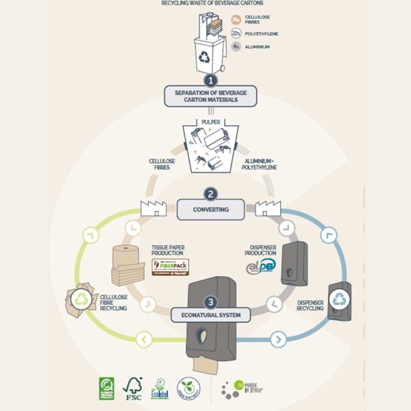 - U ovom procesu recikliranja kartonskih kutija, Lucart odvaja komponente i stvara Fiberpack materijal koji se koristi za papir od celuloznih vlakana, dok Al-Pe se koristi za proizvodnju dispenzera.